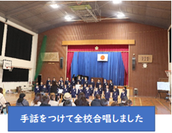 【お知らせ】 ★学校より★(左側のバナーをクリックしてください) ・学校通信(1月号) ![]() ・2月下校時刻変更のお知らせ ![]() ・緊急時(台風・大雨等)の対応について ★国・県・町からのお知らせ★ GIGAワークブックふくおか ネットの特性や問題点を理解し、トラブルが起きた場合の対応を自ら考える活用型の情報モラル教材です。(福岡県教育委員会作成) ※左記のリンク「学習支援サイト」は家庭学習にご活用ください。 ★片島小 トピック★ ![]() 11月29日(土)、第2回目となる片島小学校人権フェスティバルが開催されました。 今年もマイケル社長の熱い講演会を皮切りに、子どもたちの学習発表やクイズ大会、縦割りチーム大繩とび、 全校合唱と盛りだくさんの内容でした。 たくさんのおうちの方や地域の方に見守られながら、これまでの学習の成果を発揮して、 どの子も一生懸命取り組みました。 友達と協力しながら頑張る子どもたちの笑顔がたくさんあふれた一日となりました。 これからも全校が一体となって活動できる小 規模校の良さを生かした取組を進めていきます。 |